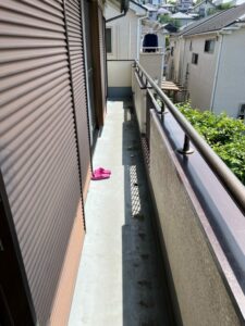 下地水洗い処理を行い、下地プライマー(クールプライマー)塗りを行います。そして、遮熱効果ある塗料(関西ペイントアレスクール)で中塗り上塗りを行います。