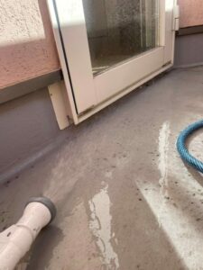 以前塗られたウレタン防水が剥がれ、手摺柱の廻りが割れてしまい、雨水が入り床の中の木材が腐食していました。